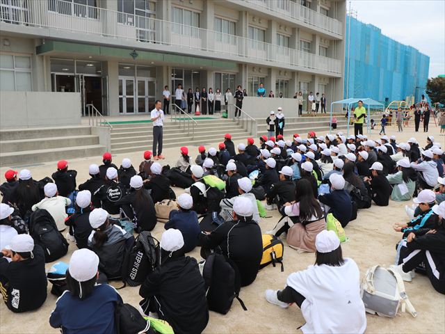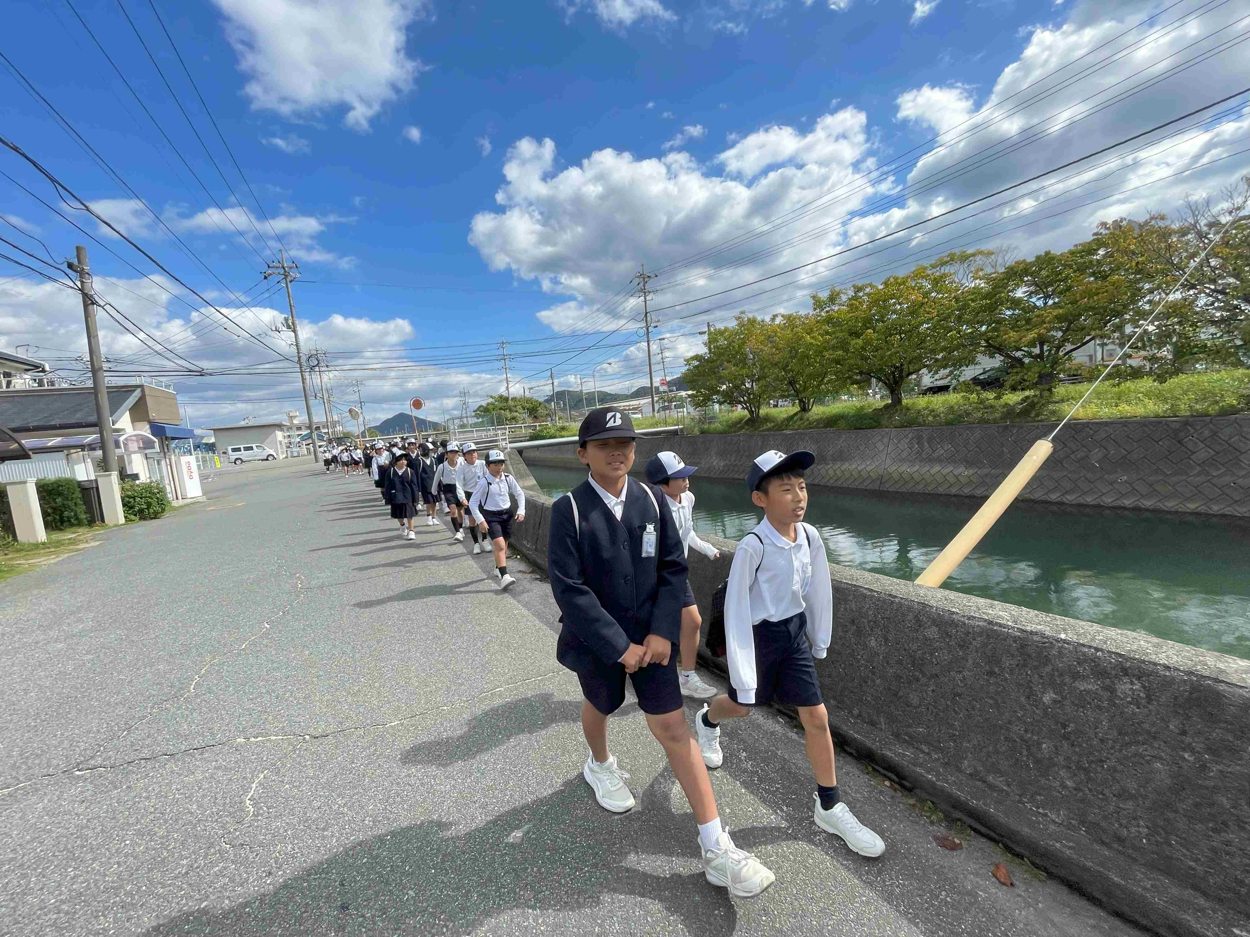 | 不審者出没等の緊急時に備え、全校児童で地区別下校を行いました。登校班の班長を中心に、運動場に集まって地区ごとに並び、班の全員が揃っているか等を確認しました。その後、みまわり隊や交通安全協会中関分会、母親クラブ、PTA地区幹事の方々に見守っていただきながら、安全に気を付けて下校しました。いつも子どもたちの見守り活動をありがとうございます。 |