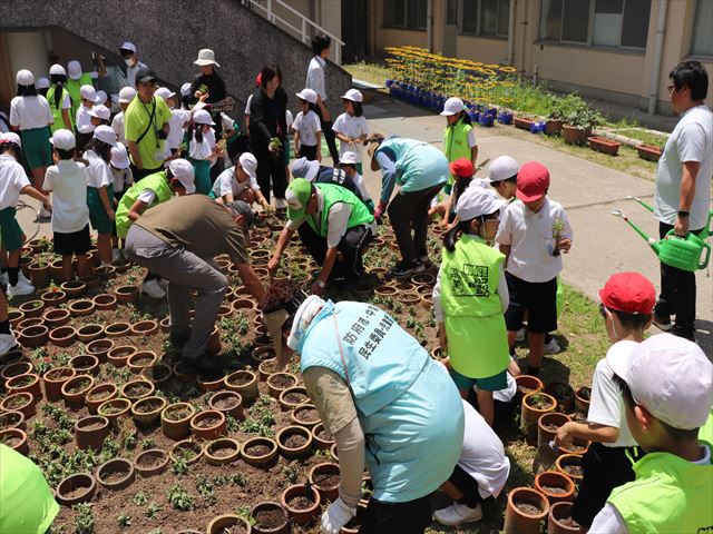 | 中関ゆめはな花壇にサルビアやマリーゴールド、ジニアの苗植えを行いました。 ジュニアボランティアとして参加した子どもたちは、地域の方に苗の植え方を教えてもらいながら楽しんで活動しました。地域の方とともに苗を植える子どもたちの顔は笑顔でいっぱいでした。 真夏にマリーゴールドやサルビア、ジニアが咲き誇り、憩いの場となるのを楽しみにしています。 |
