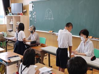 | 防府市の出身である種田山頭火にちなみ、自由律俳句づくりに5年生の子どもたちが挑戦しました。自由律俳句とは、季語が無く、五七五の音の数にとらわれず自由に表現することのできる俳句です。講師として門田先生と倉床先生をお招きし、一人ひとりアドバイスをもらいながら俳句づくりを楽しんでいました。子どもたちは、普段の何気ない日常に目を向け、気持ちを言葉で表現することができました。 |