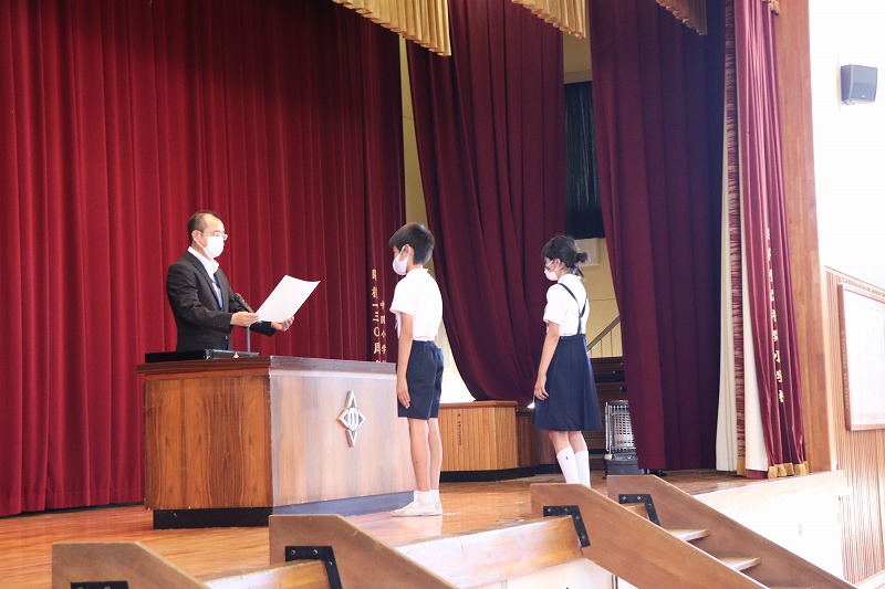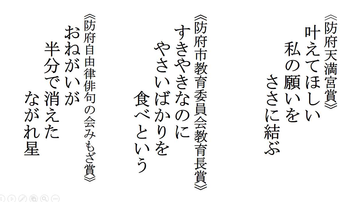 | 5年生は7月に門田先生と倉床先生をお招きして自由律俳句を楽しく学びました。その中で、第15回防府市民自由律俳句大会にて「防府市教育委員会教育長賞」「防府自由律俳句の会みもざ賞」「防府天満宮賞」を受賞した子どもたちを始業式にて全校に紹介しました。どれも思わず笑みがこぼれる俳句です。子どもたちの素直な思いや願いが伝わってきます。 |