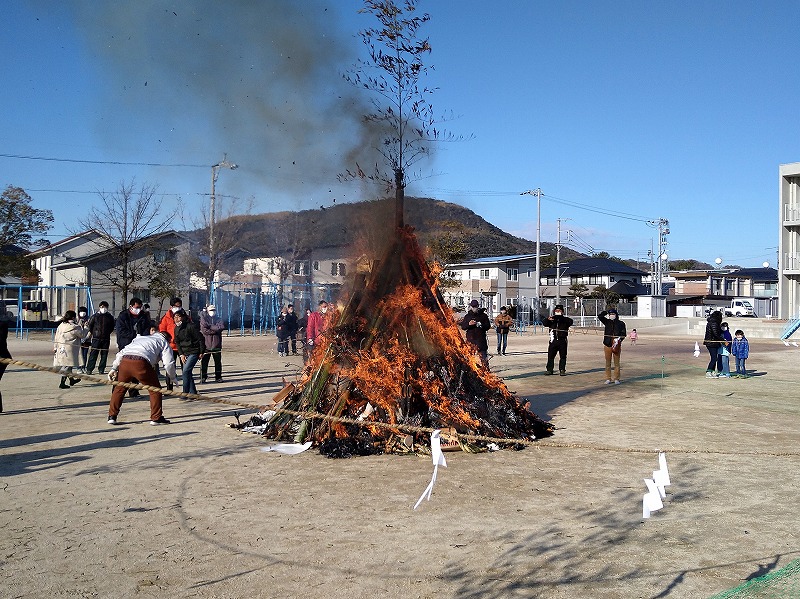 1月10日(日)、本校を会場に地域の「どんど焼き祭り」が行われました。今年は3密を避けるため、前日からしめ縄や門松などを出される地域の方もおられたようです。本校も全校児童の書き初めをやぐらに入れました。書き初めの灰が一番高く上がった人が、字が綺麗になると言われます。一番高く上がったのは誰のものだったのでしょうね。
