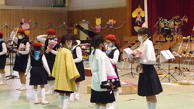 先日のミニコンサートに続き、3月7日(日)、中関小学校吹奏楽部『第27回お別れコンサート』を行いました。例年は、指導してくださった多くの先生方や、応援してくださった地域の方々をお招きしていますが、今年度はコロナ禍で、参加者を部員とその家族の方々、教職員等に限定しての開催です。縮小した形ではありますが、子どもたち、保護者、教職員が智恵を出し合って、寸劇あり、ダンスありの楽しくて、温かいコンサートにすることができました。音楽でつないだ絆は、ずっと大切にしていきたいですね。