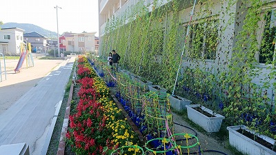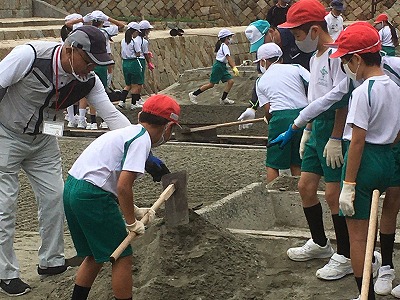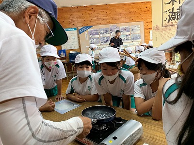 | 9月24日(木)4年4組、25日(金)4年3組、29日(火)4年2組、30日(水)4年1組がそれぞれ塩づくり体験を行いました。昔の中関で盛んに行われていた塩づくりを体験し、一つひとつの作業の大変さを知りました。午後は楽しく公園で過ごしました。家の人から作っていただいたお弁当をうれしそうに食べていました。 |