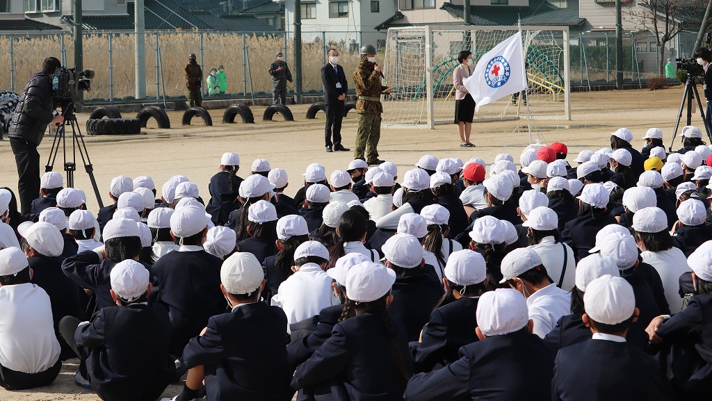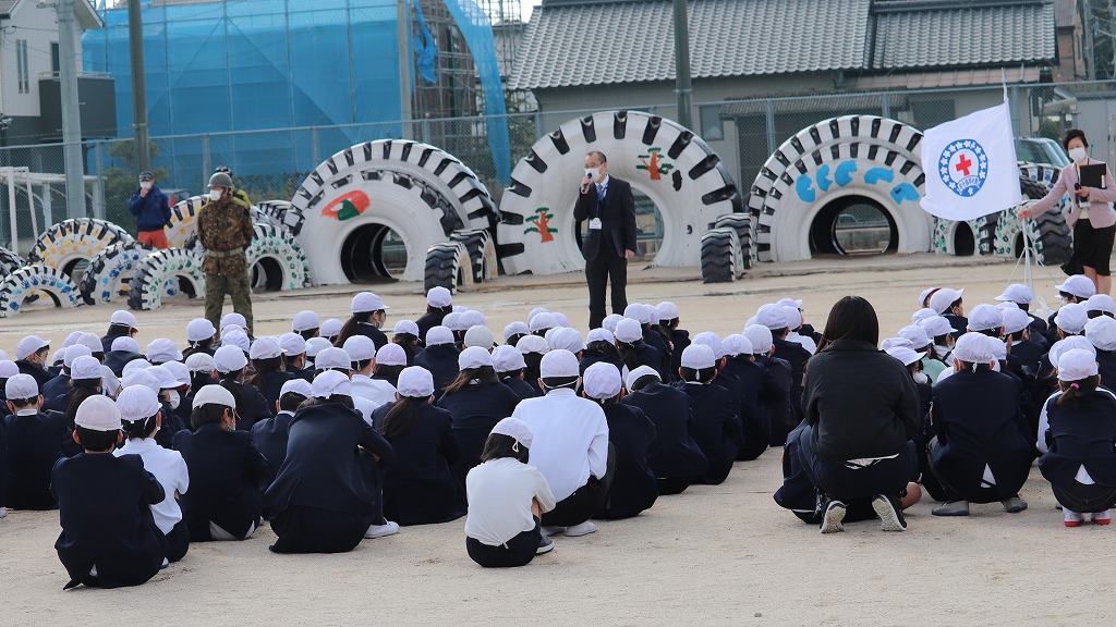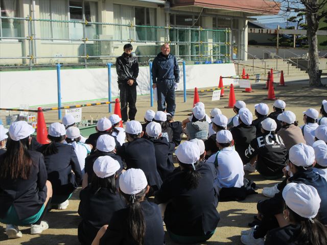 自衛隊、防府市消防本部と連携した防災学習を行いました。はじめに地震対応の避難訓練を行いました。緊急地震速報が鳴った後、児童は揺れに備えて机の下に避難しました。その後、「『お』おさない、『は』走らない、『し』しゃべらない、『も』戻らない」の約束を意識しながら、運動場に避難をしました。1学期に行った避難訓練よりも約1分早く集まることができ、子どもたちの成長を感じました。校長先生や自衛隊の隊長さんからのお話を聞き、子どもたちは地震や火災など、いざというときに備えることの大切さを改めて感じたようでした。