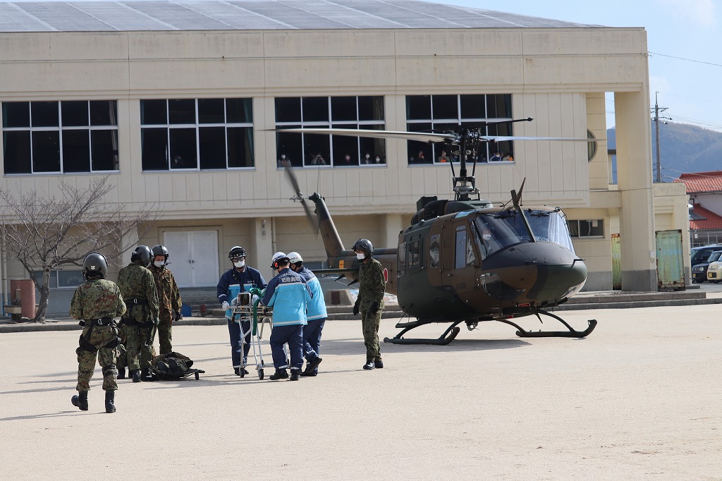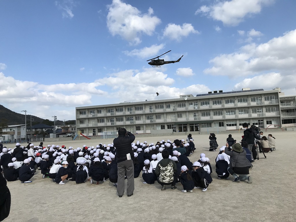 避難訓練の後は、自衛隊によるヘリコプターを使った救助訓練が行われました。ヘリコプターで屋上から人が救助されていくようすに子どもたちは圧倒されていました。その後、ヘリコプターやはしご車、消防車等の展示、紹介がありました。実物を見たり触れたりしながら自衛隊や消防本部の方の話を聞き、子どもたちが災害救助について知るとてもよい機会になりました。