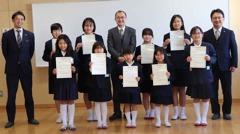 第20回ブリヂストンこどもエコ絵画コンクールに本校から440点の作品を出品しました。「しぜんがいっぱい しあわせなくらし」というテーマに合わせて、子どもたちは植物や生き物、自然とのふれあいをのびのびと絵に表しました。防府地区表彰では、工場賞に35名、工場長賞に9名が選ばれました。工場長賞を受賞した子どもたちは、工場長から表彰状を受け取り、緊張しながらもうれしそうな表情を見せていました。絵を描くことやそれらの絵を鑑賞することをとおして、環境や自然の大切さをみんなで考えていくことができればと思います。