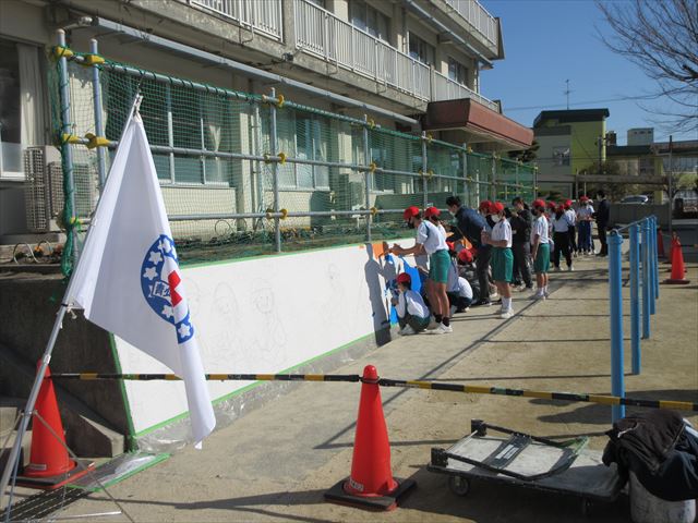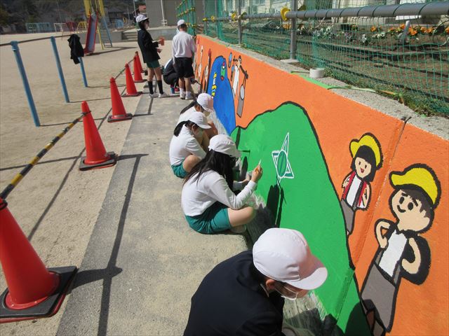 今年度も地域の塗装店の方のご協力のもと、6年生が「中関ふるさと防災壁画」に取り組みました。今年度のテーマは「ふるさと中関のすばらしさ」です。昭和17年の水害で、現在の校舎の基礎にあたる盛り土の法面の高さまで浸水したことを語り継いでいこうと、昨年度から2年間かけて行っている取組です。この壁画を見るたびに防災について考えたり、ふるさとのよさを思い出したりしてほしいです。