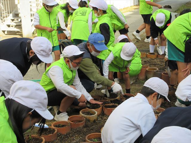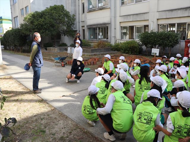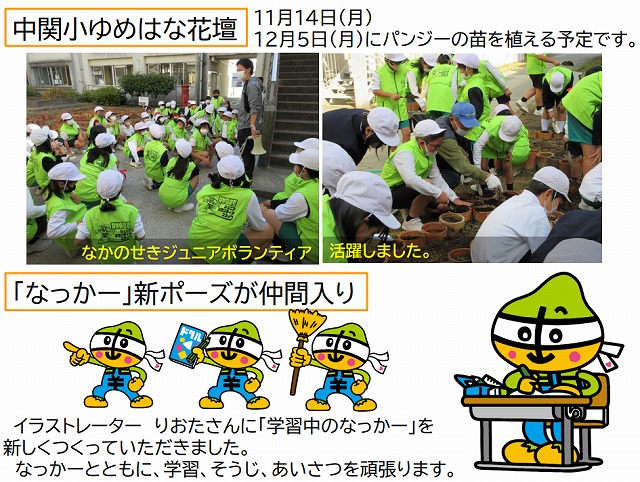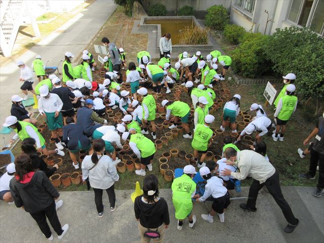 | 昼休みに、ゆめはな花壇の土づくりを行いました。全校にボランティアの参加を呼びかけると、50人を超えるジュニアボランティアスタッフが集まりました。地域の方にも参加していただきました。なっかーのスタッフベストを着て、土づくりをする子どもたちからは自然と笑顔が見られました。12月5日(月)には、パンジーの苗植えを行う予定です。 |